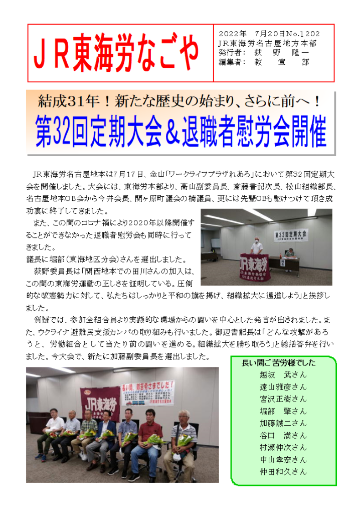 JR東海労なごや 1202 第32回名古屋地本定期大会・退職者慰労会開催